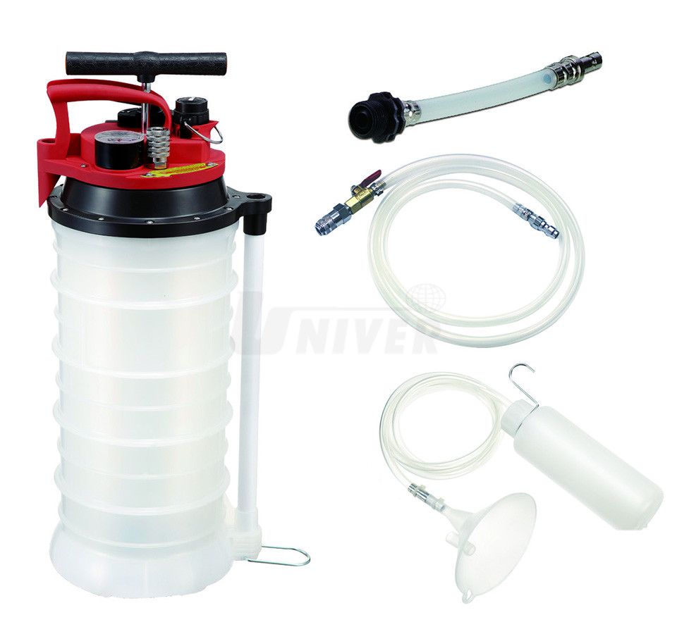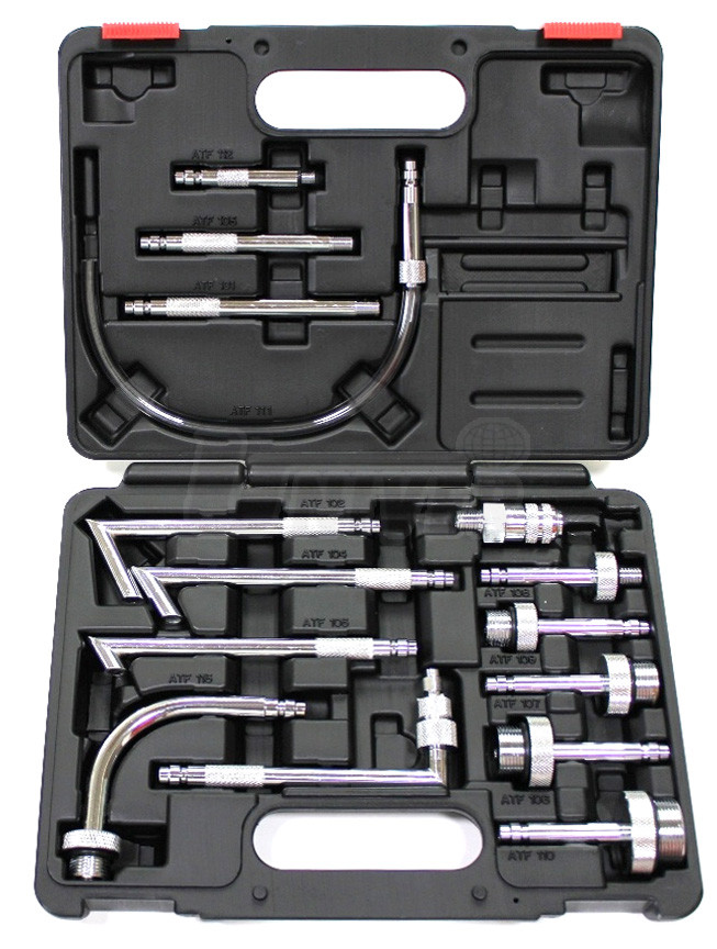 - snadné plnění nového oleje zejména do automatických převodovek z natlakovaného zásobníku 10,5 l pomocí pružných transparentních hadiček, sestavy s trychtýřem a se záchytnou nádobkou a příslušného plnicího adaptéru ze 14-dílné sady, která se dodává jako standardní příslušenství přístroje