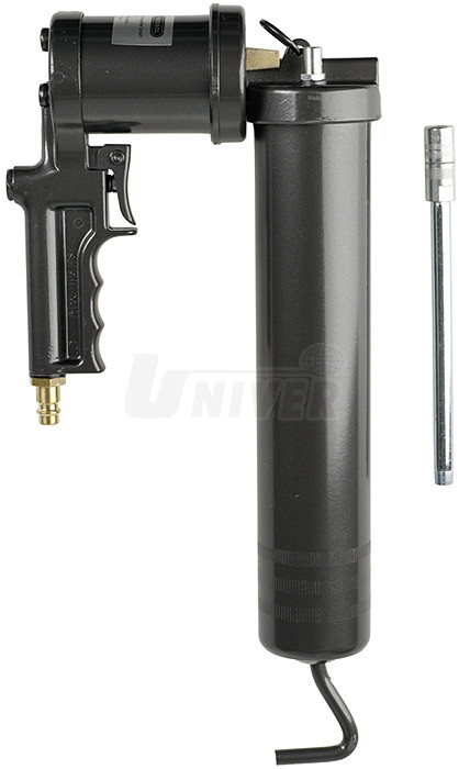 Pneumatický mazací lis umožňuje dokonalé mazání různými plastickými mazivy (až do klasifikace NLGI 2).- vývod/tlaková strana, přímý kovový nástavec G 1/8" vnější dl. 150 mm, precizní 4-čelisťová hubice G 1/8" vnitřní