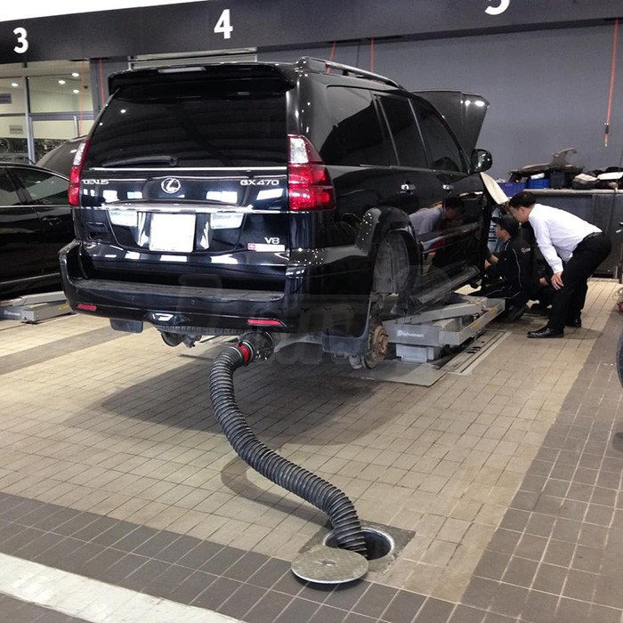 Podpodlažní systém odsávání výfukových plynů konstruovaný pro použití podlahových uzávěrů se zasouvací odsávací hadicí.- jednoduchý, méně nákladný systém odsávání výfukových plynů motorových vozidel určený zejména pro autoservisy, kde je možné bez problémů provést podpodlažní instalaci, a kde je nižší četnost používání odsávacího systému