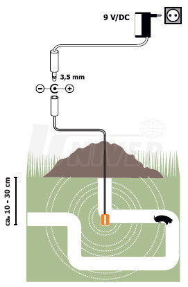 Podzemní voděodolný odpuzovač krtků, hrabošů a hryzců vysílá v rychlých intervalech agresivní seismické oscilace, které jsou široce vyzařovány v podzemí a jsou velice nepříjemné krtkům, hrabošům, hryzcům a jiným hlodavcům. Modul musí být zakopán v blízkosti jejich tunelů do hloubky cca 10 - 30 cm (nad zemí je neslyšitelný) a je napájen pomocí kabelu s provozním napětím 9V. Jeden modul stačí na ochranu až 1000 m2 zahrady.Technické údaje: