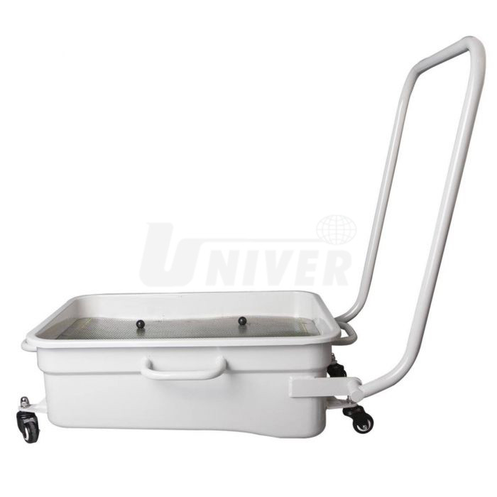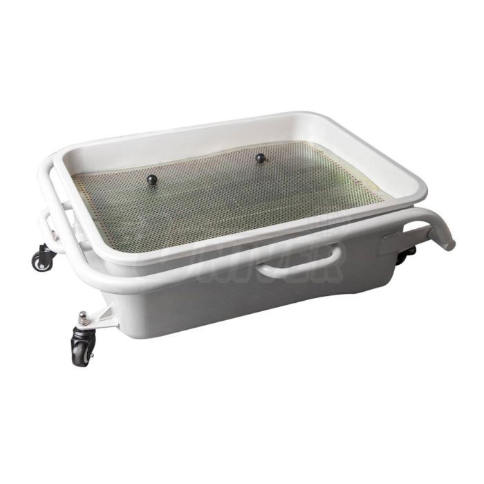 Pojízdná sběrná vana (65 l) pro vypouštění oleje a provozních kapalin je opatřena odtokovou mříží a kolečky.- odtoková mříž