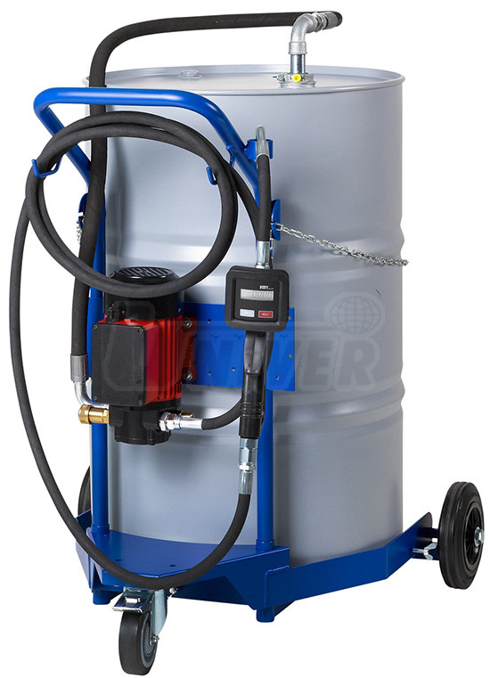 Pojízdné plničky olejů (až do SAE 90) s bočním elektrickým čerpadlem 230 V určeným pro sudy 200/220 l, s výdejní hadicí a pistolí, a s vozíkem na sudy.- elektrické čerpadlo zubové samonasávací 230 V, 500 W, 10 l/min je upevněné k držáku a příčné spojnici ve střední části rukojeti vozíku, nízká úroveň hladiny hluku