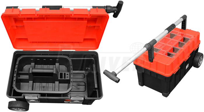 Pojízdný box na nářadí z odolného polykarbonátu se 2 kolečky, s kovovými uzavíracími klipy, se sklopným a výsuvným držadlem a s vyjímatelnou vaničkou.- praktický pojízdný kufr slouží především k uložení a převážení nářadí