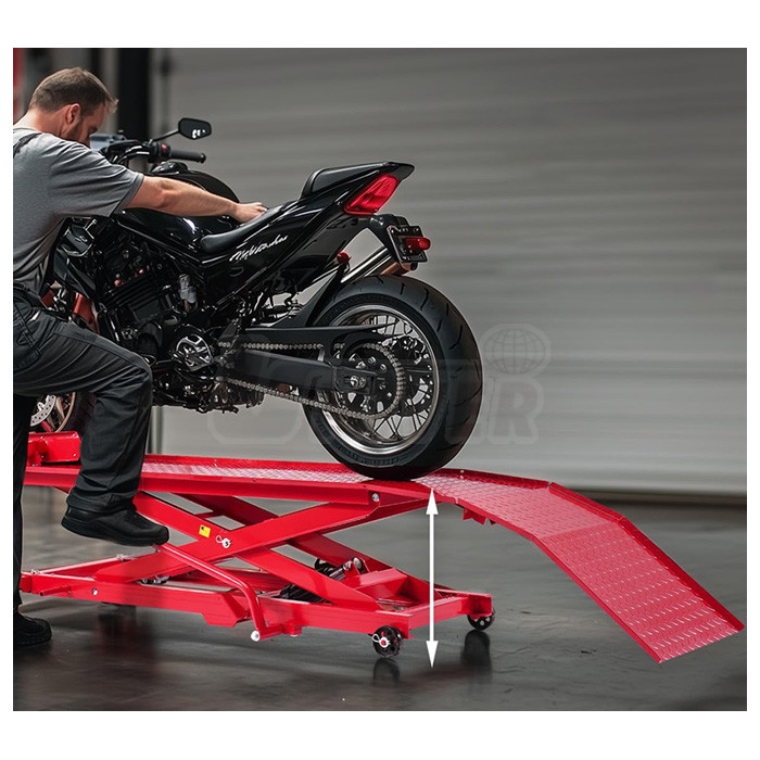 Pojazdný hydraulický zdvihák s plošinou a nožnicovou zdvíhacou konštrukciou s pedálovým ovládaním je určený na zdvíhanie motocyklov pri ich údržbe a opravách.- stabilnú polohu motocykla na plošine podporuje upínací prípravok pre predné koleso
