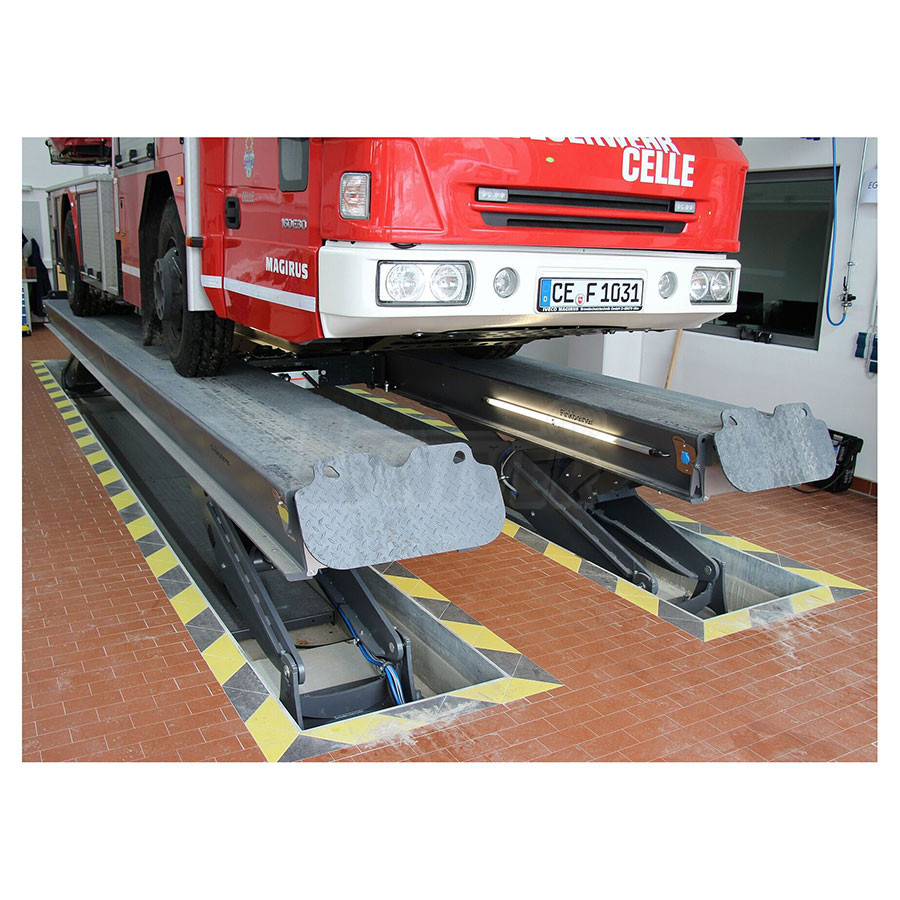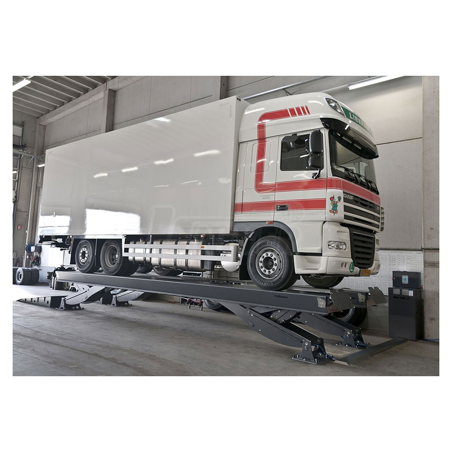 Elektrohydraulický plošinový zvedák polonůžkový (Y-tec) s nosností 25 t / 36 t s plošinami délky 9000 mm pro zvedání i těžkých užitkových automobilů..- nosnost 25 t, příp. 36 t při symetrickém zatížení, se 2 zvedacími plošinami délky 9000 mm