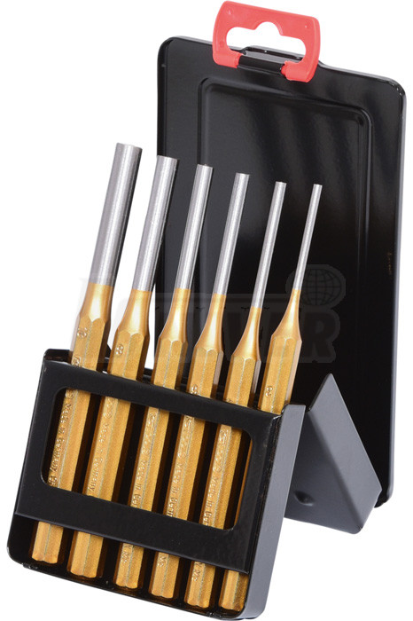 6-dílná sada vyrážečů závlaček / průbojníků různých průměrů, v praktické plechové úložné skříňce.- materiál: speciální chrom-molybdenová ocel