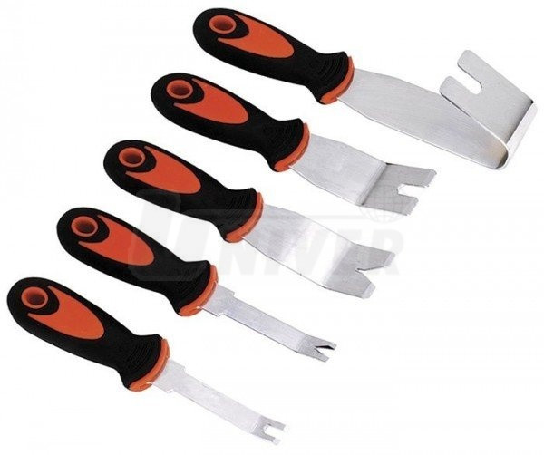 5-dílná sada speciálních přípravků z nerezoceli slouží především k rychlé, snadné a šetrné demontáži čalounění a dalších interiérových součástí bez jejich poškození. Různě tvarované konce nástrojů umožňují univerzální použití na odstranění většiny druhů spon. Dvoukomponentní ergonomicky tvarované rukojeti s otvorem pro zavěšení.Objednávka tovaru