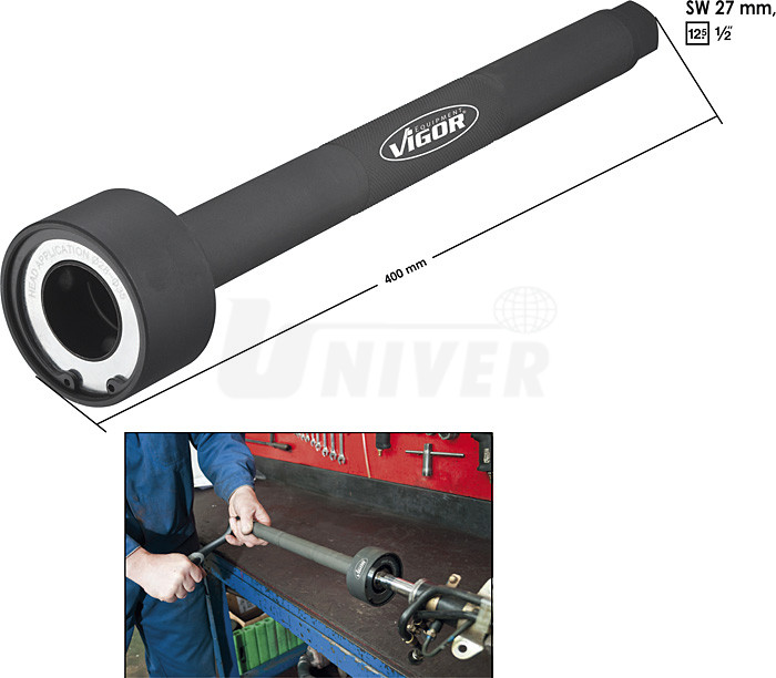 Přípravky pro odbornou a rychlou výměnu axiálních spojovacích tyčí osobních a lehkých dodávkových automobilů i vozů SUV umožňují bezproblémovou montáž dlouhých spojovacích tyčí přes otevřenou konstrukci.VIGOR V2684 1/2" (27 mm) je určen pro hlavy spojovacích tyčí 28 - 35 mm.