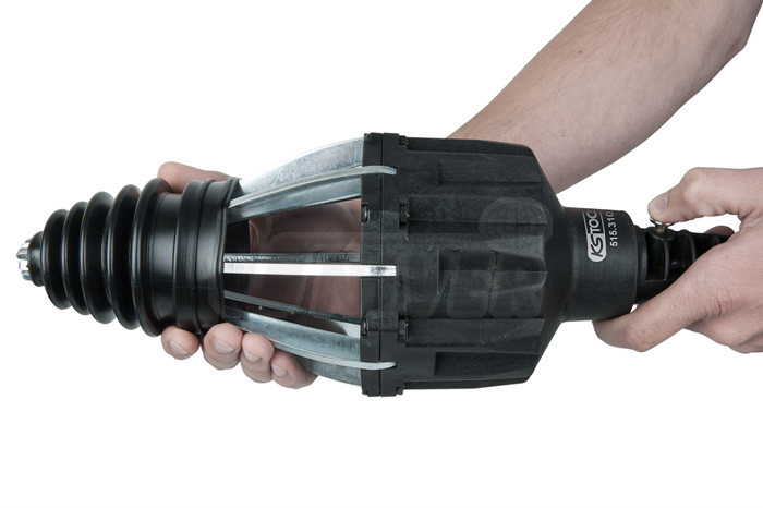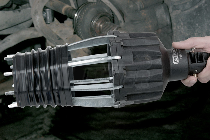 Pneumatický přípravek pro manžety náprav a také pro vozidla s pohonem všech kol a transportéry s hnacími kloubovými hřídeli od 25 do 115 mm.- robustní rozpínací ramena (8 ks) se rozvírají působením stlačeného vzduchu
