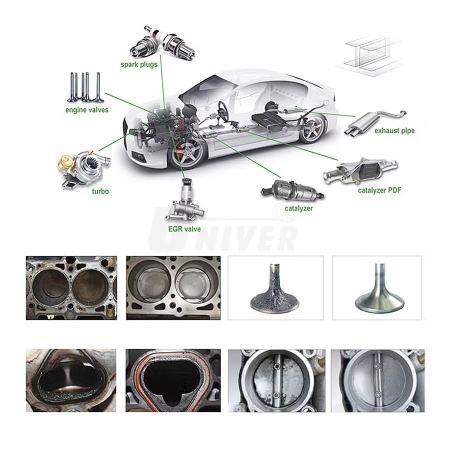 v niektorých častiach spaľovacích motorov sa v prevádzke vytvárajú tuhé alebo polotuhé karbónové usadeniny, jedná sa napr. o ventily, piesty, piestne krúžky, sacie a výfukové systémy, vstrekovanie paliva, zapaľovacie sviečky, lambda sondy, turbodúchadlá, filtre pevných častíc atď.