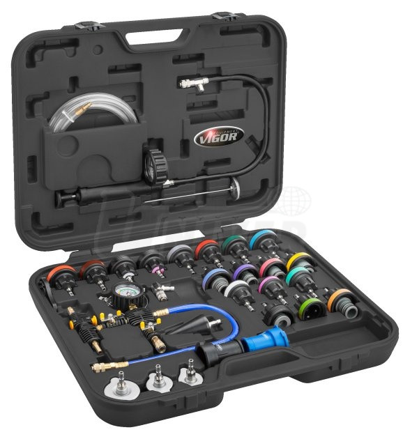 Univerzální tlakový a podtlakový přístroj pro zkoušení chlazení a topení (29-dílná sada) v plastovém kufříku.- kompletní sada pro servisní práce na chladicím systému a topení