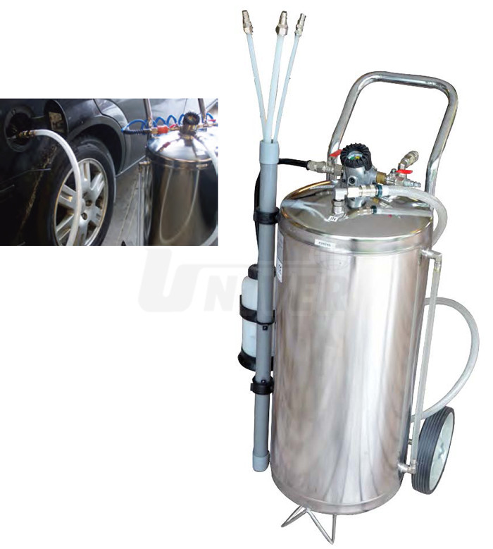 Pneumatický přístroj pro odčerpávání benzinu / nafty z nádrží vozidel se používá v případech, kdy dojde k záměně paliva, nádrž je třeba při opravě vypustit apod.- zásobník z nerezové oceli o objemu 45 litrů, opatřený dvěma kolečky, 2 antistatické ukostřovací kabely, přepadové vedení a 3 sondy pro odsávání paliva