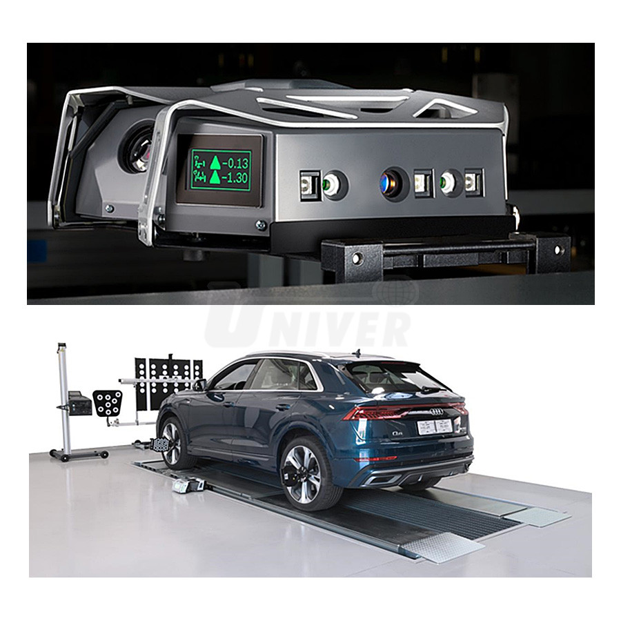 Přístroj pro měření / seřizování geometrie kol na internetové bázi, kdy kompaktní webová technologie nahrazuje celý vozík s počítačem a vytváří tak zejména před přístrojem více prostoru.- přístroj na internetové bázi pro velmi rychlé a přesné měření se snímači umístěnými na levé a pravé straně zvedáku