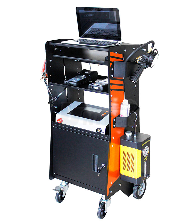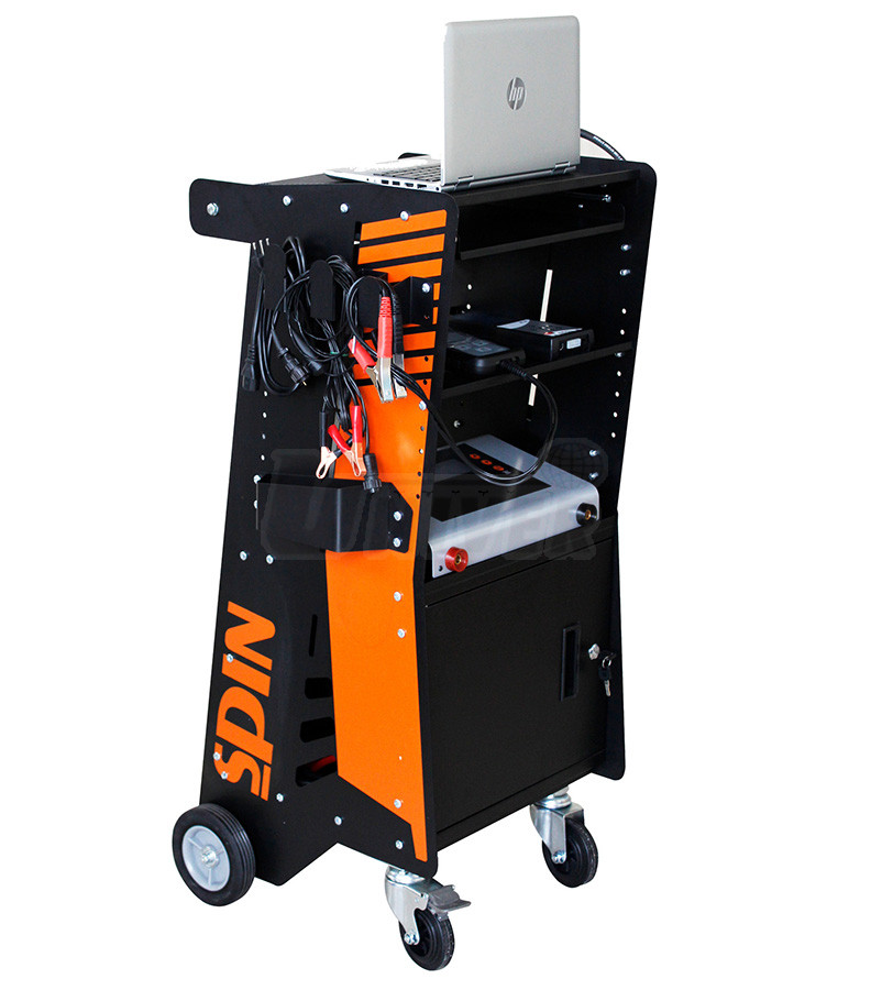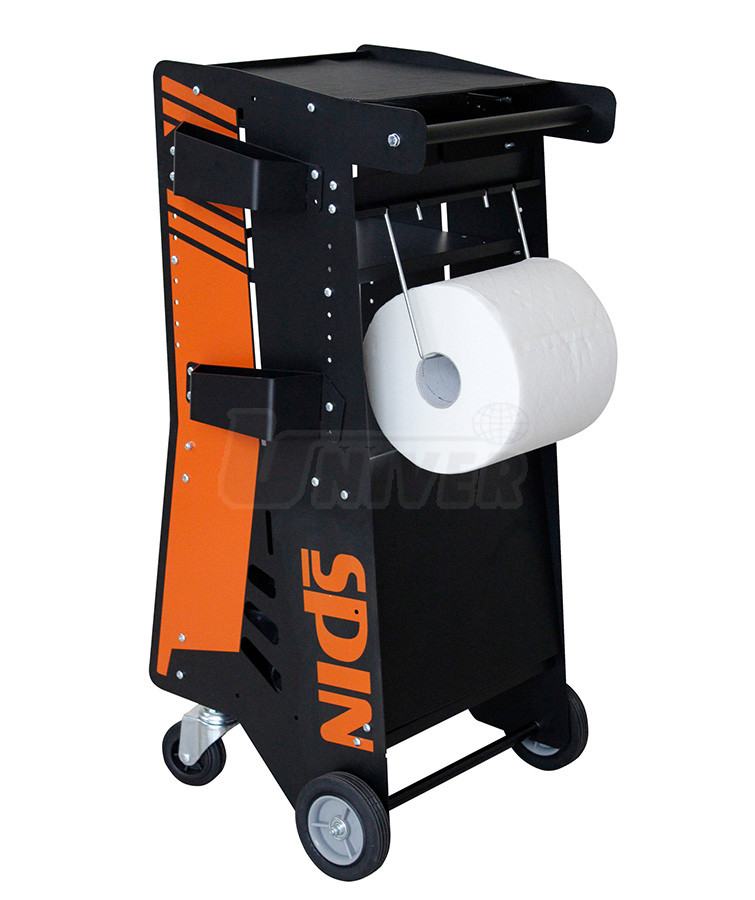 Dílenský vozík pro umístění PC / diagnostických přístrojů se 3 policemi, spodní uzamykatelnou skříňkou, 3 kabelovými navijáky, 3 boxy pro spotřební materiál a držákem role papíru.- 3 police