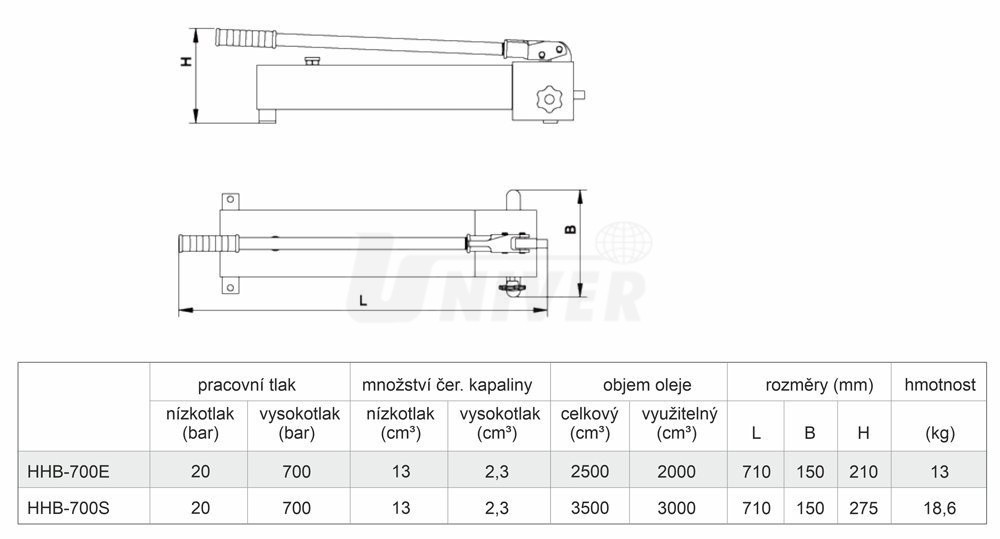 20 bar 700 bar 13 cm3 2,3 cm3 2500 / 2000 cm3 710 x 150 x 210 mm (včetně páky) 730 x 190 x 190 mm 13 kg |