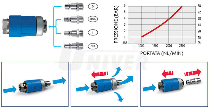 Bezpečnostní rychlospojky na stlačený vzduch umožňují rozpojování bez rizika vymrštění hadice, protože rychlospojka je nejprve uzavřena a pak odtlakována.- univerzální použití pro rychlospojky typu CH (Švýcarsko), I (Itálie), USA (Spojené státy) a D (Německo)