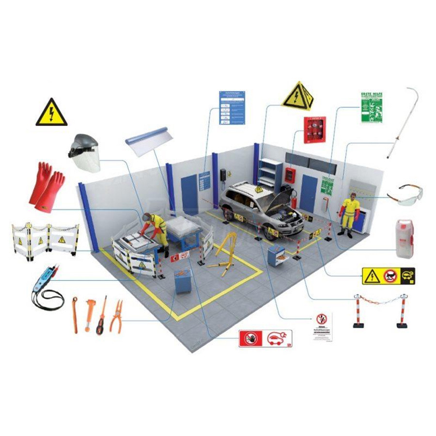 Střední sada (32-dílná) osobních ochranných / bezpečnostních pomůcek a výstražných tabulek pro provádění údržby a oprav (servisu) elektrických vozidel.- údržba a opravy (servis) elektrických vozidel vyžadují, aby osoby, které takový servis vykonávají, měli předepsanou kvalifikaci a používali příslušné osobní ochranné / bezpečnostní pomůcky a stání pro servis elektromobilů musí také být odpovídajícím způsobem zajištěné / vybavené některými výstražnými tabulkami