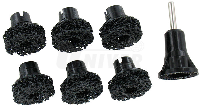7-dílná sada brusných přípravků pro jednoduché a rychlé čištění a odrezování kontaktních ploch nábojů kol, brzdových kotoučů a brzdových bubnů.- brusný přípravek se pevně sešroubuje s adaptérem / držákem