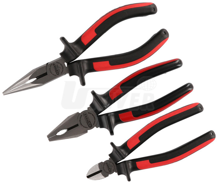 3-dílná sada nejčastěji používaných kleští (kombinované, stranové štípací a s půlkulatými čelistmi).- dvoukomponentní ergonomické rukojeti