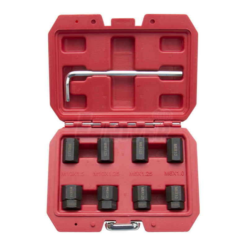 Sada 8 přípravků a šestihranného klíče pro vyšroubování a zašroubování závrtných šroubů / šteftů bez nebezpečí jejich poškození v praktickém plastovém kufříku.- velikost: M6 x 1,0 mm, M8 x 1,25 mm, M10 x 1,25 mm, M10 x 1,5 mm (vždy jeden přípravek pro vyšroubování a jeden pro zašroubování)