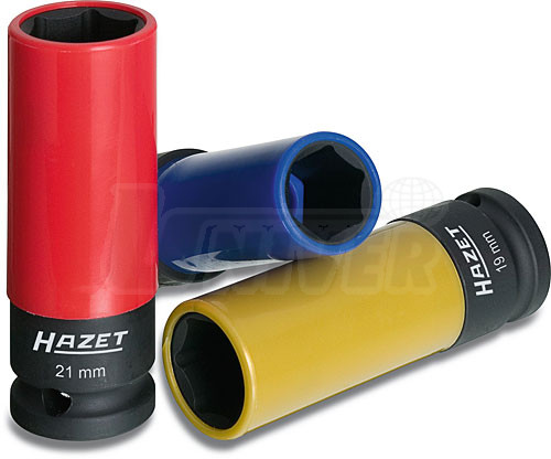 Sada obsahuje šestihranné 1/2" nástrčné kované hlavice 17/19/21 mm v dlouhém provedení (85 mm) s ochranným potahem. Ten zabraňuje poškození hliníkových disků při montáži/demontáži kolových šroubů zejména při použití pneumatického utahováku.