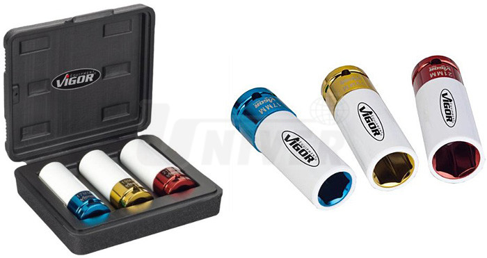 3-dílná sada speciálních kovaných hlavic s ochranným potahem obsahuje šestihranné 1/2" - nástrčné hlavice 17/19/21 mm z chrom-vanadia.Jejich plastový ochranný potah zabraňuje poškození hliníkových disků při utahování kolových šroubů pneumatickým utahovákem.
