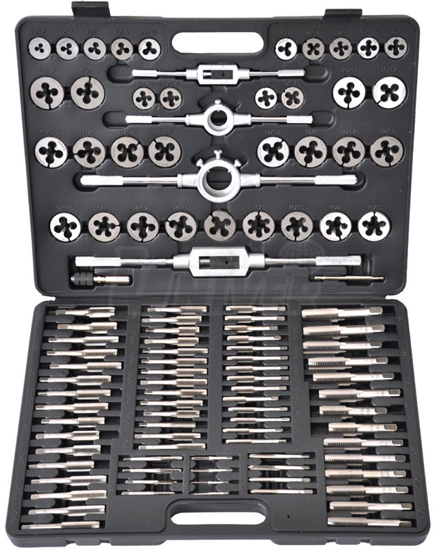 110-dílná sada metrických závitníků a závitových oček ze standardní nástrojové oceli pro ruční závitování pomocí vratidla.Obsahuje: