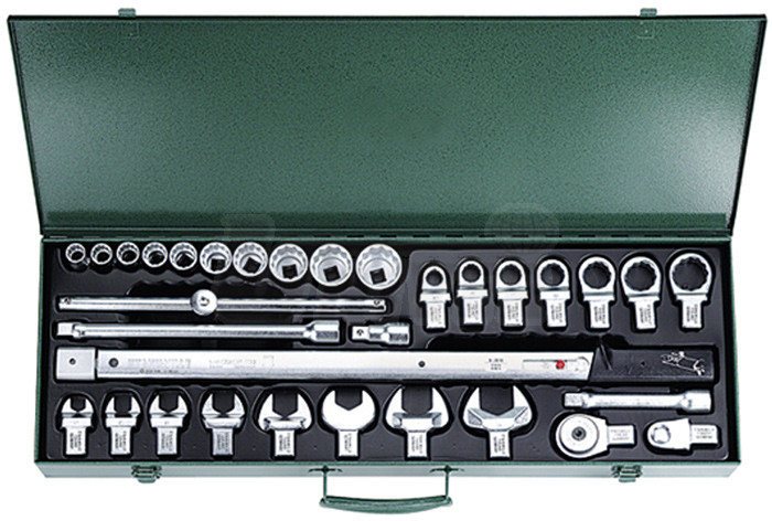 32-dílná sada momentového klíče Stahlwille Service MANOSKOP 730/40 (80-400 Nm) a zástrčných klíčů v plechové skříňce.Obsah sady: