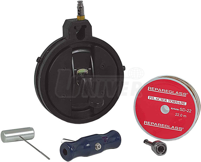 Jednoduchá, ale praktická sada umožňuje při vyřezávání skel práci jen jedné osoby. Velká přísavka s otočným mechanismem a zpětnou pružinou táhne drát při vyřezávání zpět a přebírá tak roli druhé osoby/mechanika sedící uvnitř vozidla. Přísavka se ve vozidle na sklo zhruba v jeho středu upíná bezpečně a rychle pomocí osvědčené pákové techniky. Drát se přitom vede poblíž skla, takže nemůže dojít k poškození palubní desky nebo čalounění. Používá se řezací pilkový drát, kulatý nebo čtverhranný drát příliš vhodné nejsou. Vyřezávat lze takto i poměrně velká skla.Sada obsahuje:
