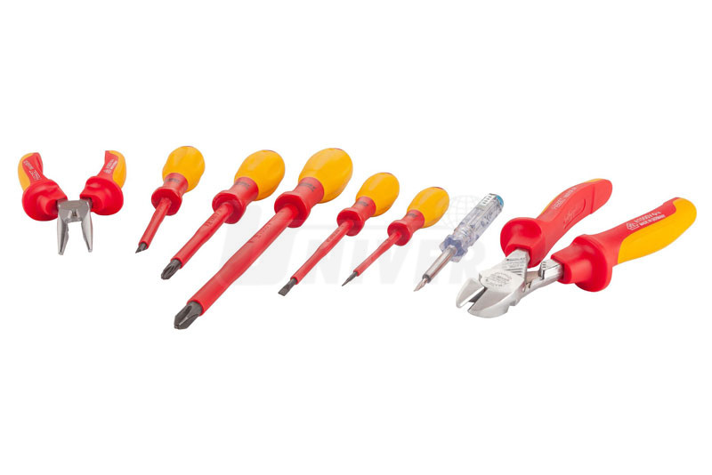 8-dílná sada nářadí pro elektrikáře klasifikace VDE izolovaného až do 1000 V AC (střídavé napětí) nebo až 1500 V DC (stejnosměrné napětí).- sada nářadí se šroubováky, kleštěmi a zkoušečkou napětí s ochrannou izolací pro práci pod napětím a v blízkosti částí pod napětím až do 1000 V AC a 1500 V DC