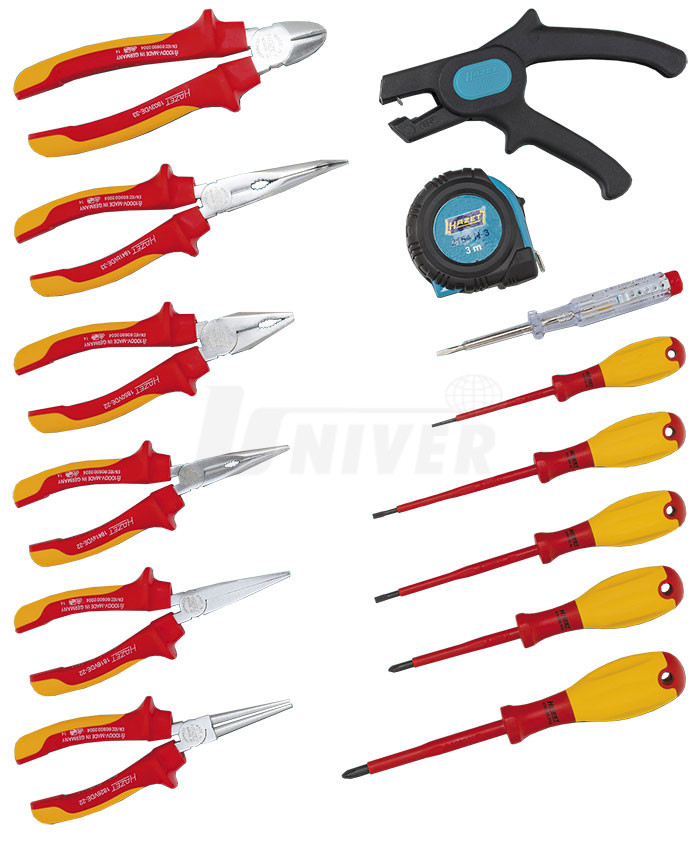 14-dílná sada nářadí VDE pro elektrikáře je vyrobena z vysoce kvalitního chrom-vanadia.- kleště mají ergonomický 2-komponentní plastový ochranný povrch rukojetí (červený/žlutý)
