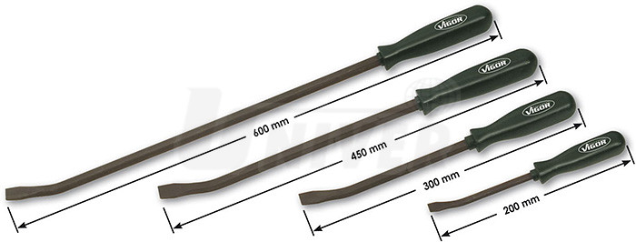 4-dílná sada obsahuje 4 páčidla (velikosti: 200 mm, 300 mm, 450 mm a 600 mm) s ergonomickým držadlem a kovovou částí s koncovým zploštělým vyhnutím. Konec držadla je odolný i při úderu kladivem.