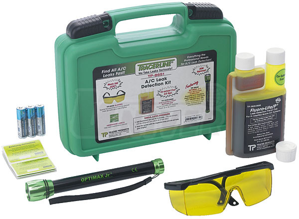 - pokud je klimatizační systém naplněn UV-kontrastní látkou, ta v místě netěsnosti při osvícení UV-lampou jasně fluoreskuje