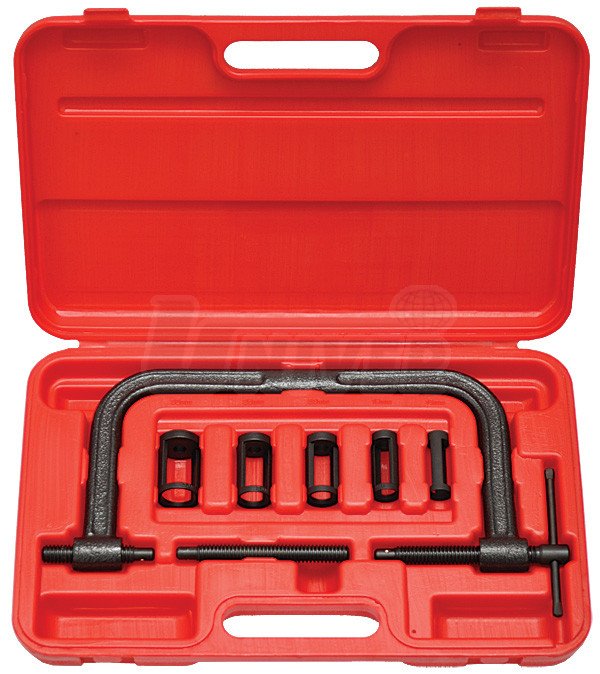 Praktická sada přípravků pro montáž/demontáž ventilů (stlačování ventilových pružin) benzinových i naftových motorů osobních a lehkých užitkových automobilů i motocyklů nejběžnějších značek s 5 stlačovacími adaptéry 16 mm, 19 mm, 23 mm, 25 mm a 30 mm. Tyto adaptéry zajišťují správnou montáž a snadné stlačování ventilových pružin.