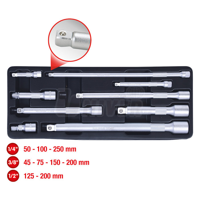 Praktická 9-dílná sada sklápěcích nástavců ke gola-sadám různých rozměrů (čtyřhrany 1/4", 3/8" a 1/2").- 9-dílná sada různých sklápěcích prodlužovacích nástavců se čtyřhrany 1/4", 3/8" a 1/2"