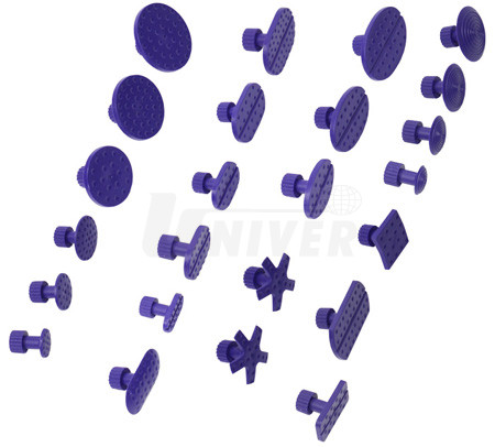 Sada (24 ks) fialový plastových (PA) nalepovacích vytahovacích adaptérů se standardní hlavou pro opravy důlků a promáčklin na karosériích vozidel technologií PDR (Paintless Dent Repair).