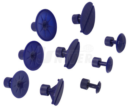 Sada (9 ks) modrých plastových nalepovacích vytahovacích přísavek pro opravy důlků a promáčklin na karosériích vozidel technologií PDR.