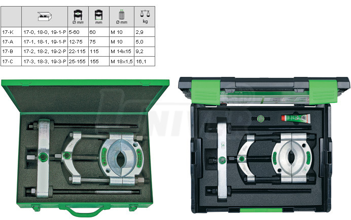 Sady separátorů (oddělovacích přípravků) s rychloupínacími vřeteny německé firmy KUKKO-Werkzeugfabrik patří do nejvyšší kvalitativní třídy v Evropě. Sady v kovovém kufříku (17-K, 17-A, 17-C) nebo v plastovém kufříku KUKKO BOX SYSTEM (17-B) jsou sestaveny z různých separátorů, stahovacích přípravků pro separátory a prodlužovacích kusů k nim, případně i tuby speciálního maziva na vřetena stahováků KUKKO Spezialfett (17-B).Vlastnosti: