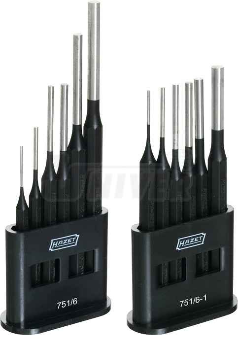 Dvě 6-dílné sady vyražečů / vytloukačů závlaček v plastových stojáncích. Všechny vyvražeče jsou vyrobeny z vysoce kvalitního chrom-vanadia. Splňují požadavky DIN 6450 Form C.Sada HAZET 751/6-1 obsahuje:
