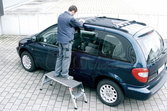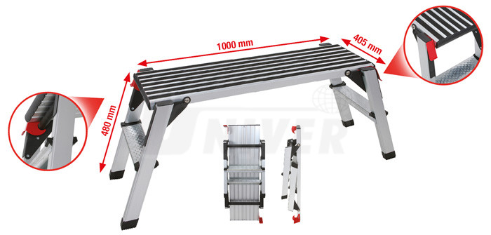 Hliníková skládací pracovní plošina s rýhovaným protiskluzovým profilem a se 2 schůdky na obou stranách.- stabilní konstrukce