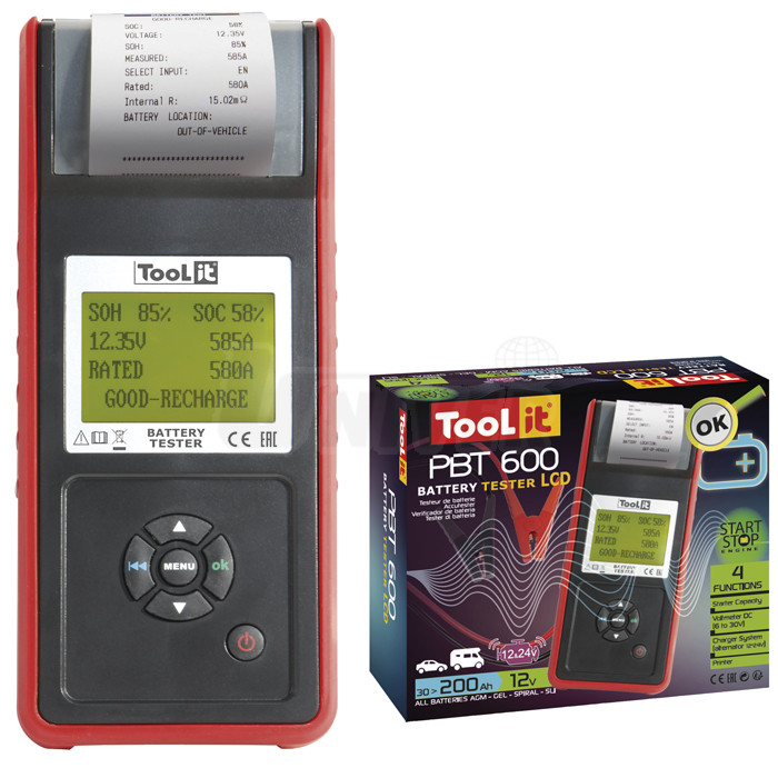 Digitální přístroj s tiskárnou pro zkoušení různých druhů baterií (12 V), startovací napětí a stav startérů (12 a 24 V) i volnoběžné a nabíjecí napětí alternátorů (12 a 24 V).- testy různých druhů baterií 12 V bez jejich vymontování nebo vymontovaných (tekutý elektrolyt, SLI, VRLA/GEL, AGM/SPIRAL atd.)