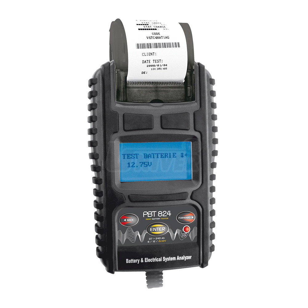 Digitální přístroj s tiskárnou pro zkoušení baterií (6 / 12 / Pack 24 V – 2 x 12 V), startovacího napětí a stavu startérů (12 a 24 V) i alternátorů (12 a 24 V).- měří napětí a stav nabití baterií 6, 12 V a 24 V Pack (2 x 12 V)