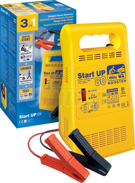 Jako nabíjecí zdroj slouží GYS Start UP 80 k automatickému nabíjení všech druhů startovacích baterií od 45 Ah do 170 Ah (olověné, gelové,kalciové atd.).