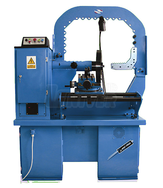 Stroj pro rovnání a soustružení hliníkových i ocelových disků 13"-30" s hydraulikou s 1 hydraulickým válcem, s mechanickým upínacím vřetenem, s převodovkou a s posuvným soustruhem.