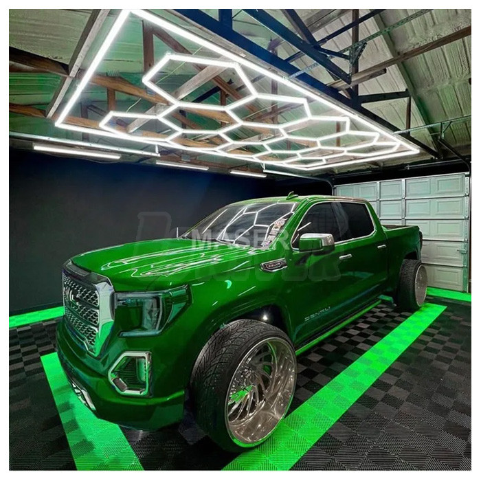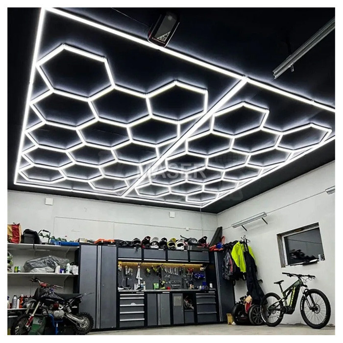 Moderné stropné LED osvetlenie s vysokým svetelným výkonom a plynulým stmievaním k ideálnemu osvieteniu autosalónov, servisných dielní a pod.- šesťuholníkový LED systém s dizajnovou štruktúrou včelieho plástu