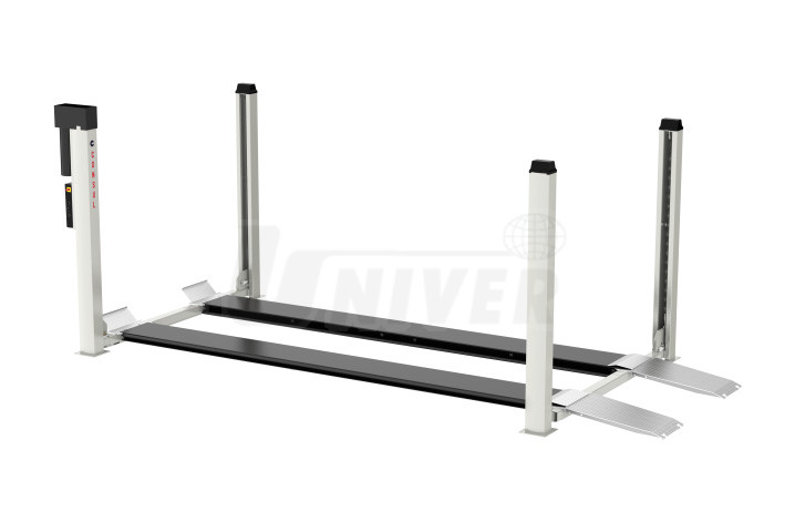 Čtyřsloupový elektrohydraulický kompaktní zvedák (12000 kg) s dlouhými plošinami (700 x 7000 mm) pro zvedání dlouhých osobních automobilů a transportérů.- nízká konstrukční výška ve spuštěném stavu