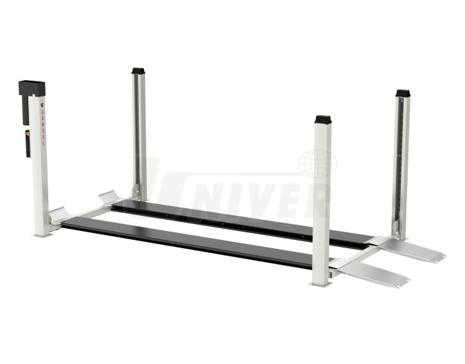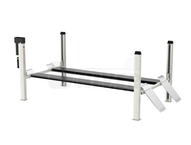 Čtyřsloupový elektrohydraulický kompaktní zvedák (4500 kg) s dlouhými plošinami (4810 mm) pro zvedání velkých osobních automobilů a transportérů.- velmi nízká konstrukční výška ve spuštěném stavu