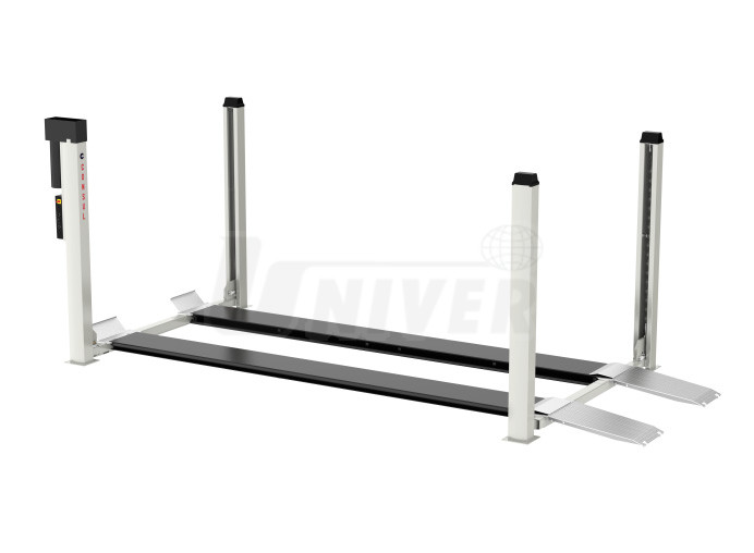 Čtyřsloupový elektrohydraulický kompaktní zvedák (4500 kg) s velmi dlouhými plošinami (5500 mm) pro zvedání velkých osobních automobilů a transportérů.- velmi nízká konstrukční výška ve spuštěném stavu