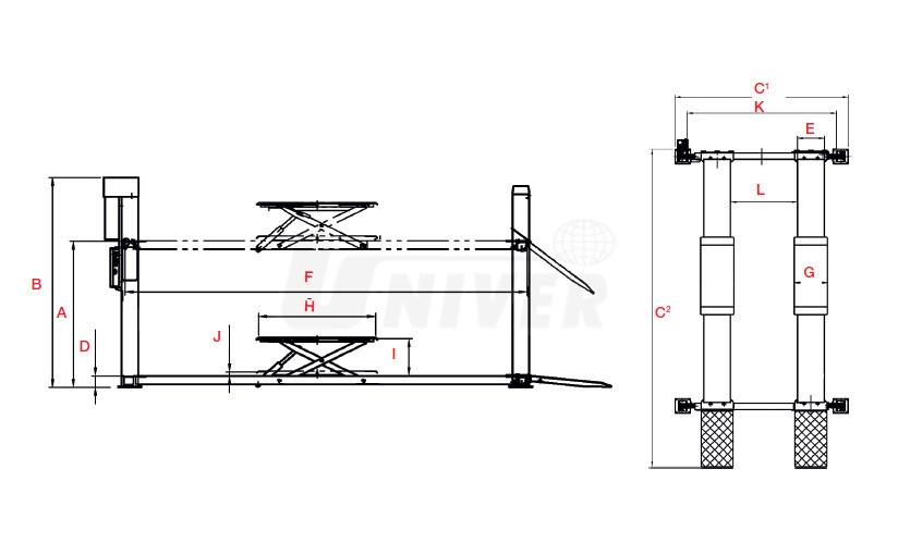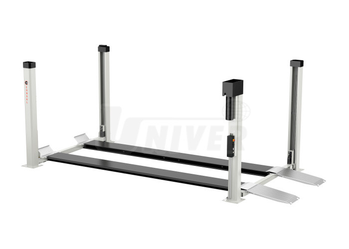 Čtyřsloupový elektrohydraulický kompaktní zvedák (5500 kg) s hladkými plošinami (5500 mm) pro zvedání osobních automobilů a transportérů až do velkého rozvoru.- nízká konstrukční výška ve spuštěném stavu