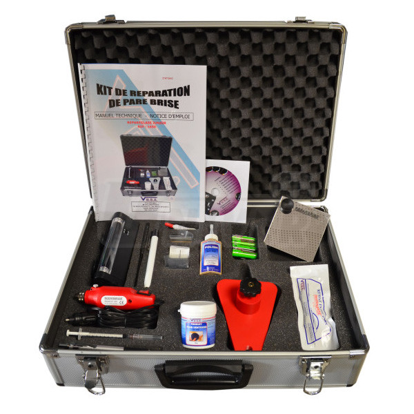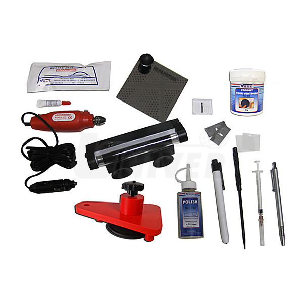 1 ks alumíniový kufrík 1 ks PVC mostík / držiak vstrekovača s plunžrom na aplikáciu živice 1 ks UV-lampa 12 V s časovým spínačom na vytvrdzovanie opravnej živice 1 ks tesniace mazivo na prísavky 1 ks pomocné kontrolné zrkadlo s prísavkou 1 ks ceruzkové svietidlo 1 ks leštiaca pasta 60 ml 1 ks amplule opravnej/vyplňovacej živice (stačí na 5 až 8 opráv) 1 ks minivŕtačka / leštička 12 V 1 ks karbidový bit do vŕtačky / leštičky 1 ks špeciálny prípravok / pero s karbidovou špičkou 5 ks zoškrabovacích žiletiek 1 ks ampulky špeciálnej dokončovacej živice (stačí pre viac ako 60 opráv) 10 ks štvorčekov mylarovej fólie 1 ks dlhá ihla / sonda |